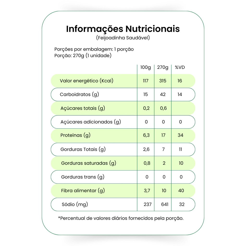 A Feijoadinha oferece o melhor da feijoada brasileira em uma versão mais equilibrada. Feita com feijão preto, arroz integral e uma seleção cuidadosa de embutidos com baixo teor de sódio, como lombo suíno, linguiça e bacon, garantindo o sabor autêntico, mas sem exagerar no sal. Acompanhada de farinha de mandioca crocante, temperada com páprica defumada, louro e outros temperos naturais, essa refeição é ideal para quem busca uma opção saborosa e nutritiva, sem abrir mão da saúde.